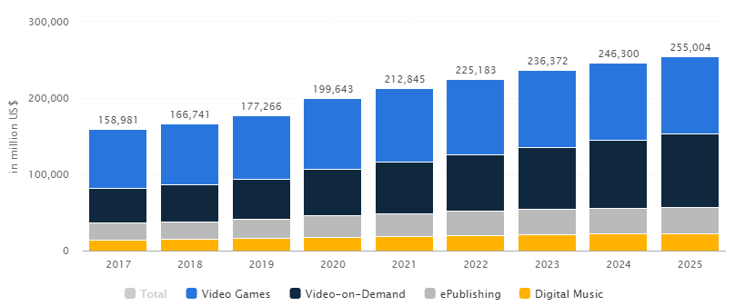 Według szacunków serwisu Statista.com, największą częścią rynku rozrywki online są gry video, a cały rynek rozrywki online, do którego można zaliczyć oprócz gier video, również treści video na żądanie (VoD), ePublishing oraz streaming muzyki online, których to rynek łącznie może wzrosnąć z prawie 159 mld USD w 2017 roku do 255 mld USD w roku 2025, co stanowi wzrost o 60%.